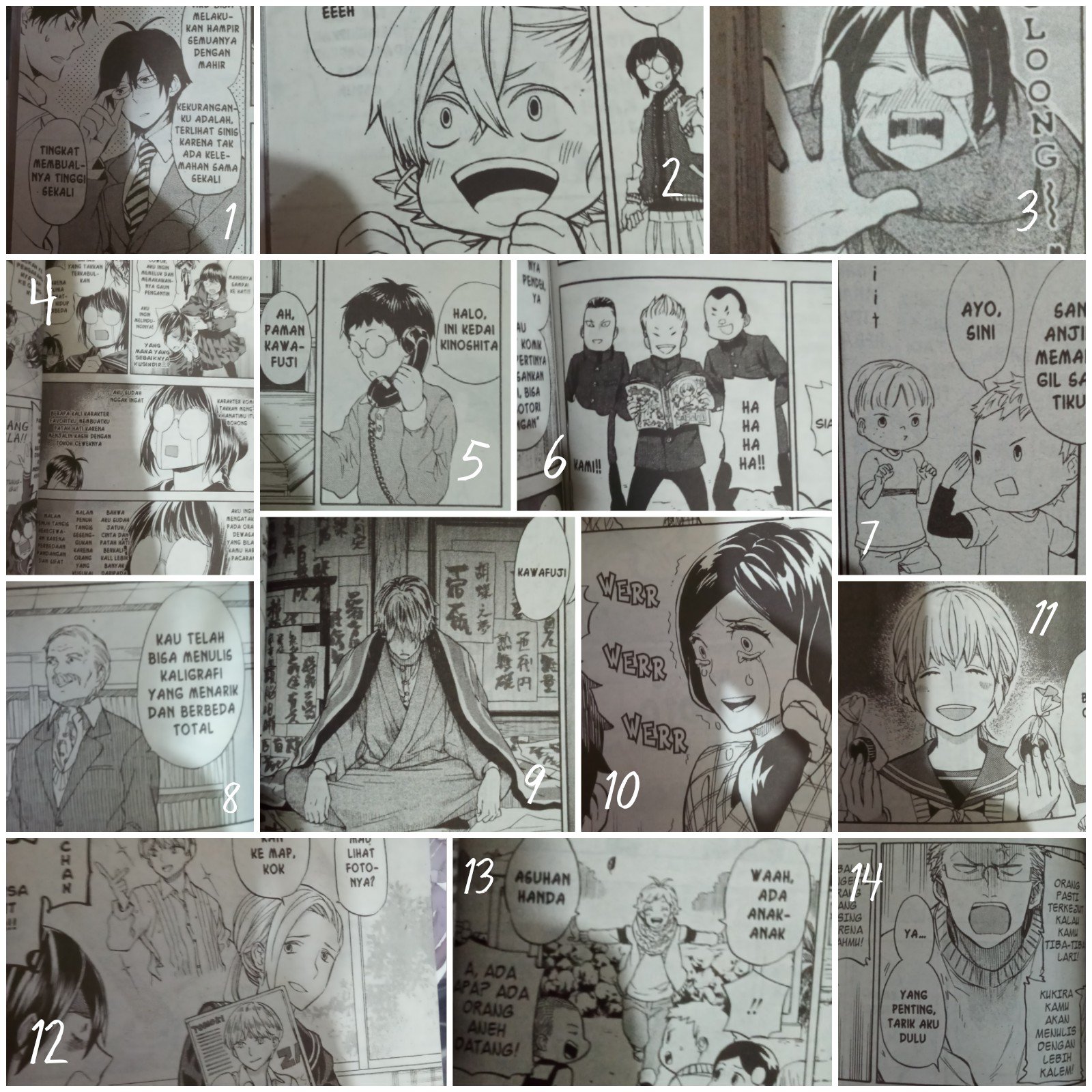 12) Toma dan Toya: Si kembar jenius SD cabang, kakak kelasnya Naru. Pintar, bahkan lebih pintar dari Miwa. Yang akhirnya juga menjadi murid kelas kaligrafi Handa.