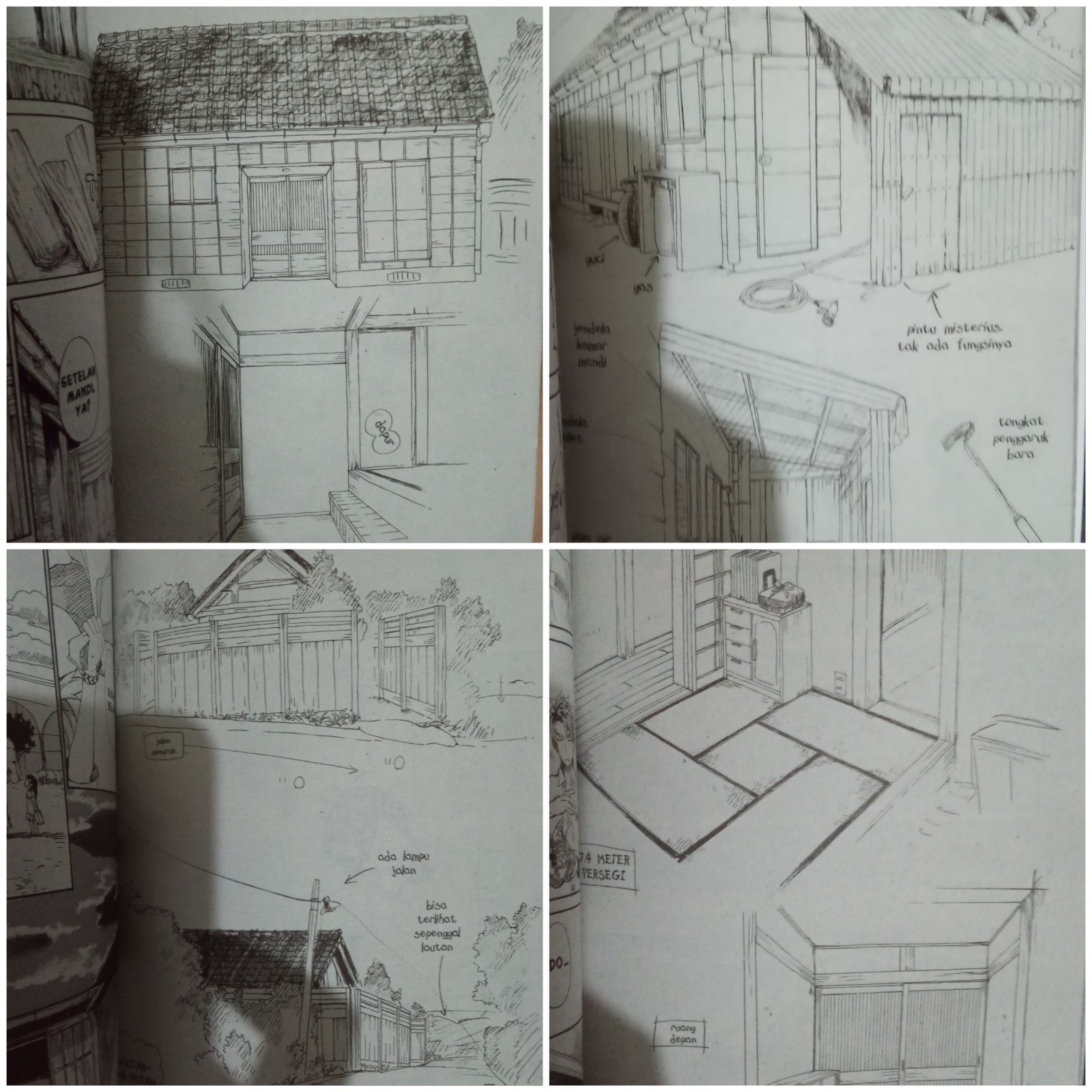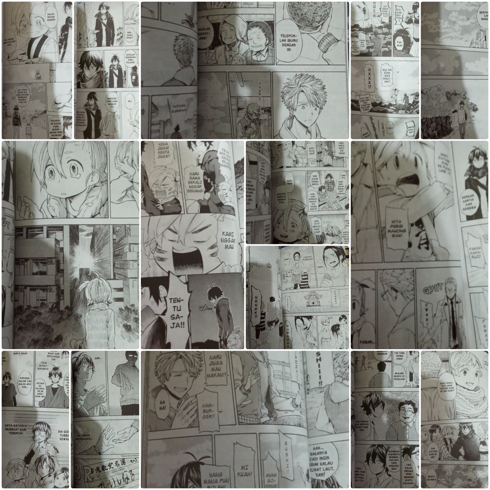 Di volume-volume pertama memang penggambaran para karakternya agak beda dengan yang di anime, terutama yang paling mencolok adalah model rambutnya. Yap, tapi beberapa volume kemudian model rambutnya jadi berubah tapi ga mengubah ….:D Lebih rapi maksudnya. Nah, karena lebih rapi itulah model rambut mereka makin jelas dan menjadi khas barakamon banget. Yap, terutama adanya ahego kembar di beberapa karakter seperti pada Handa, Miwa, Shin, Kosuke, Akki,, terus model rambut Naru yang khas sekalee, Tama juga, dll. Lalu, mata para karakternya juga khas sekali. Pakaian yang dikenakan pun sederhana. Penggambaran latar belakangnya juga nice, belum lagi kerap kali disajikan denah tempatnya jadinya serasa semakin nyata.